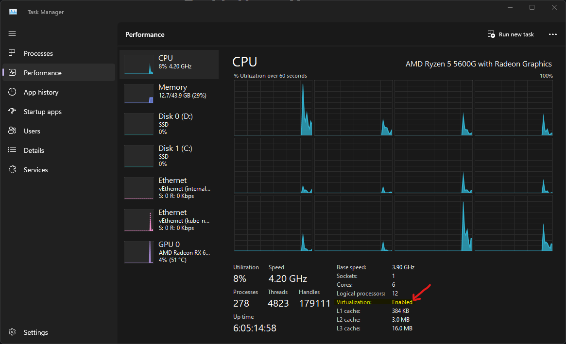Pastikan Processor support untuk virtualization. Untuk cek bisa ke Task Manager > Performance > CPU