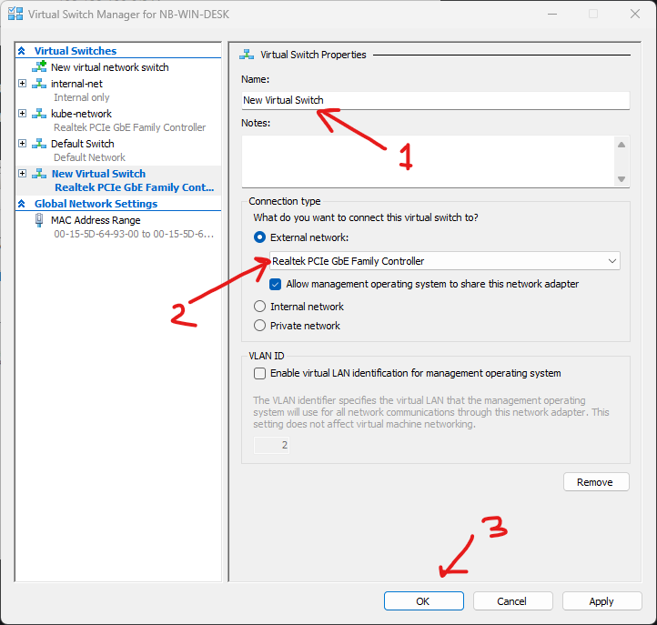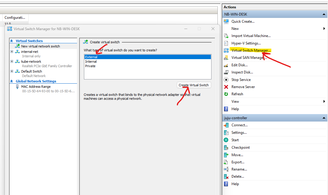 Buka hyper-v manager, di menu sebelah kanan, pilih Virtual Switch Manager > External > Create Virtual Switch