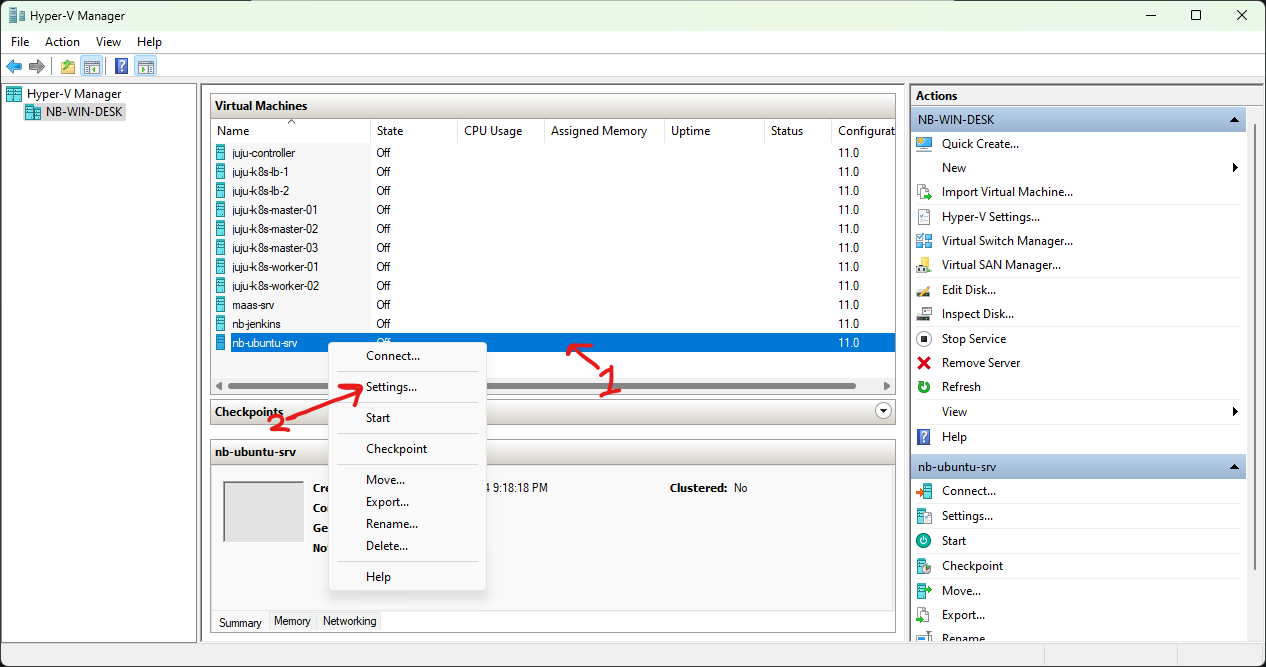 - Klik kanan di list VM, klik Settings..