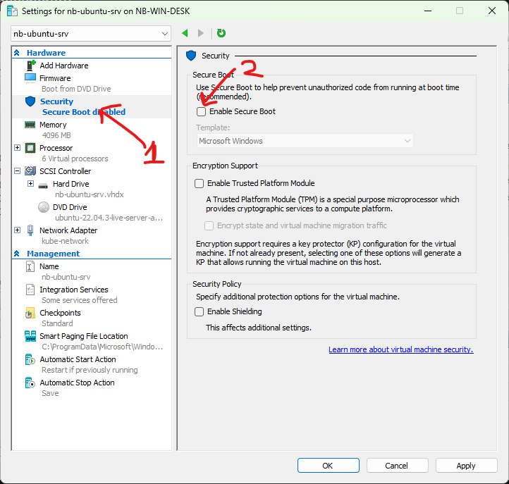 Karena disini menggunakan VM generasi 2, perlu menonaktifkan secure boot, jika ingin booting ke ubuntu.