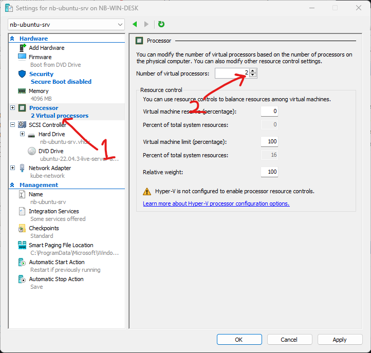 Disini juga secara default VM akan menggunakan semua vcpu yang ada dalam Hyper-v Host. Untuk membatasi vcpu bisa ke menu Processor > Sesuaikan Number of virtual processor