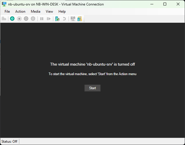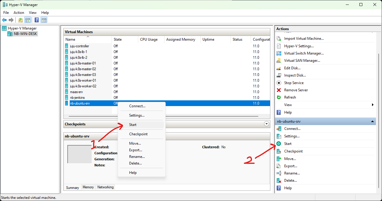 Kembali ke hyper-v manager, untuk menyalakan VM, bisa dengan Klik kanan list VM > Start, Atau dengan Pilih VM > Sebelah kanan Start