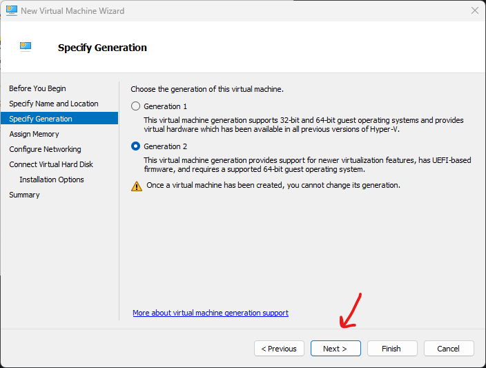 - Untuk menu berikutnya, disini saya memilih VM generasi ke 2 yang telah menggunakan UEFI-Based Firmware. Jika sudah, klik next