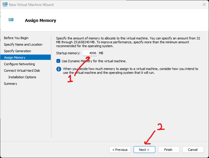 - Di menu Assign Memory, sesuaikan jumlah memory yang akan dibutuhkan oleh VM. Secara default, vm dalam Hyper-v menggunakan Dynamic Memory yaitu memory dalam vm akan berubah secara dinamis tergantung load yang dijalankan dalam VM. Jika sudah diatur, klik Next