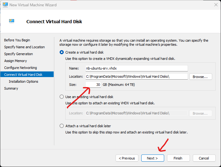 - Di menu Connect Virtual Hard Disk, pilih Create a virtual hard disk. Sesuaikan size dari disk VM. Disini saya memilih 30GB. Jika sudah, klik Next